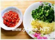 2、将泡辣椒切细,香葱切成葱花,生姜大蒜切成沫(比例为大蒜2生姜1)。