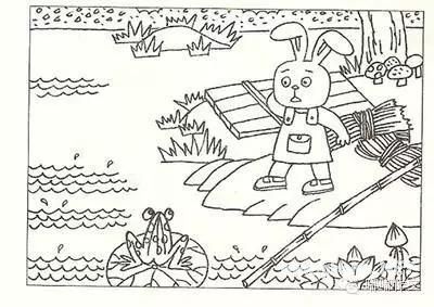 第一步:找一找:这一环节家长可以把这幅图打印下来,让孩子写在图片上。图片的左边看起,我们能看到小河——草地——青蛙——荷花——小白兔——木板——草堆——竹竿——大树——蘑菇。观察时一定要让孩子们指着图说。