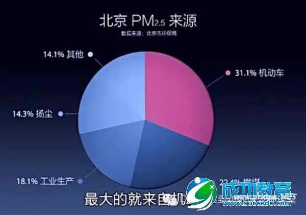 视频00:40:32 这个扇形统计图表示了北京PM2.5的来源分布,31.1%来自于机动车,22.4%来自于燃煤,18.1%来自于工业生产,14.3%来自于扬尘,14.1%来自于其他方面。柴静由此认为PM2.5最主要的来源是机动车。