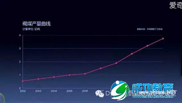 视频00:34:35 柴静用这张单式折线图展示了2002年到2011年褐煤的生产折线统计图,它的产量递增,特别是在2006年后的产量增长速度迅速攀升。褐煤是煤化程度最低的矿产煤。一种介于泥炭与沥青煤之间的棕黑色、无光泽的低级煤。