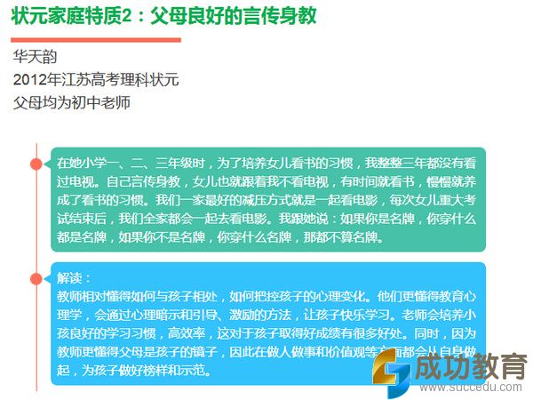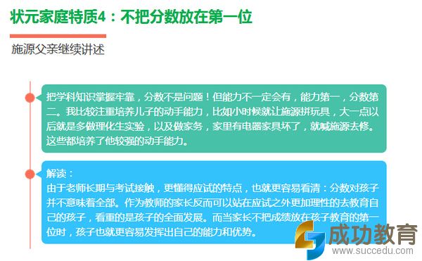 比如:状元父母一般都注重培养孩子规律的生活习惯;父母并非大包大揽成为孩子的用人,而是放手让孩子独立,自己管理自己;家庭氛围都比较和谐民主。