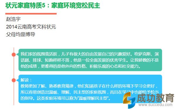 比如:状元家庭条件各有不同,但无论父母是富贵还是贫穷,是教授还是农民,孩子们都认同自己的父母,亲子关系十分融洽。