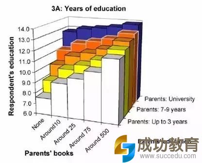 这张图表比第1张图多了一项“父母本身的受教育情况”,我们可以很直观的发现:家中的藏书量越高,父母本身受教育程度如何对孩子的受教育水平影响越小!也就是说:哪怕你只是小学毕业,只要你家里书够多,你的孩子和那些博士的孩子最后受教育程度差异也没多少!当然前提是你自己也要爱看书,爱买书,能给家庭带来一种享受读书的氛围!