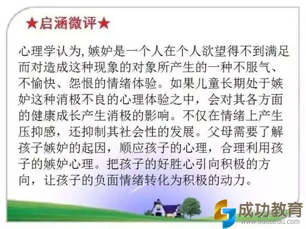2.不当教育方式。有的家长常对拿自己的孩子跟别人家孩子比较,甚至拿孩子的不足跟他人的优点对比,会让孩子误以为家长喜欢别人而不爱自己,由不服气而产生嫉妒。