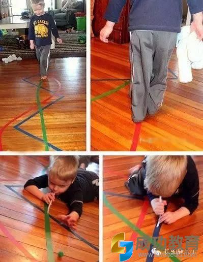 依然是胶条,父母在地板上贴出任意的几条路线,让孩子们按照轨迹去行走,可以培养他们的平衡能力哦,大一点的孩子可以用吸管吹球,让小球按照轨迹行进,也是非常好玩的游戏。