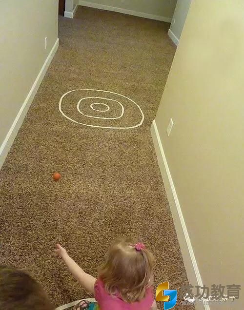 在地板上设置一个区域做为目的地,让孩子在一定距离外用小手将小球推动,看看小球能否停留到目的地,可以将目的地分区域设置得分,全家一起来玩,看看最后谁的得分最高。