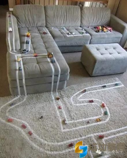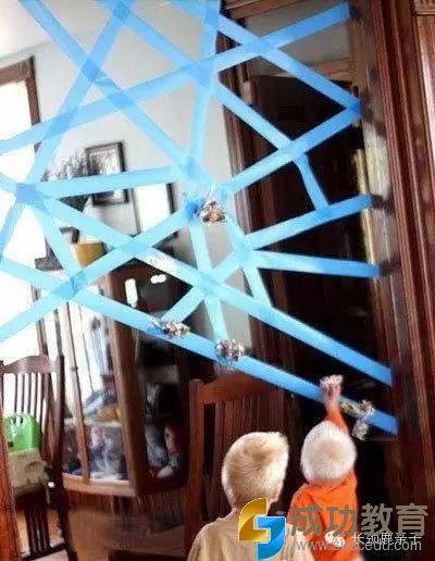 这个玩法依然与胶条有关,找一个家里的过道,将胶条悬空随意贴成若干轨迹,孩子们将手中的小车或者小人偶扔出,如何能让它们通过障碍而不被粘住,要考验小朋友的手眼协调能力了,哈哈,这个游戏是不是让成人也很心动。