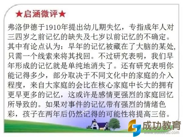 大多数小朋友在3岁时能回忆起一年前发生的很多事情,这些记忆将持续到5、6岁,但当他们7岁以后,童年记忆将迅速消退。