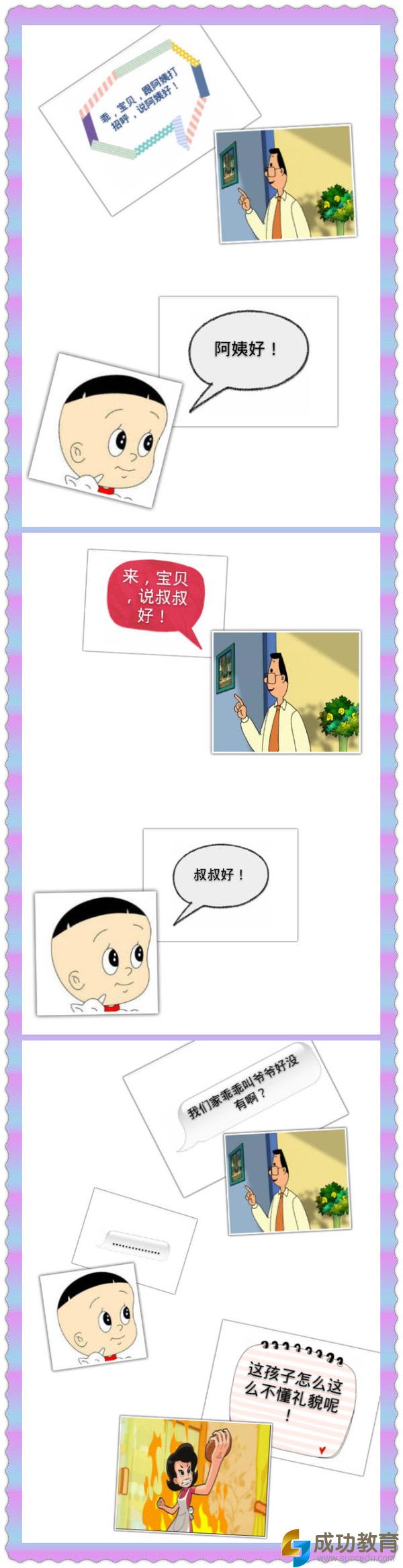 教 育孩子懂礼貌固然是我们家长的责任和义务,见面就知道笑咪咪打招呼的孩子固然大家都觉得喜欢可爱,可是这并不是懂礼貌的全部内容,很多孩子可能因为自身比 较害羞内向而说不出口,尤其是面对陌生人的时候,这个时候我们的父母要做的不是责怪孩子而是告诉孩子:妈妈知道你害羞,不过叔叔是妈妈的好朋友哦,你要是 跟叔叔打招呼,妈妈会很高兴的!一味的责怪只会让孩子越来越排斥和别人打招呼。