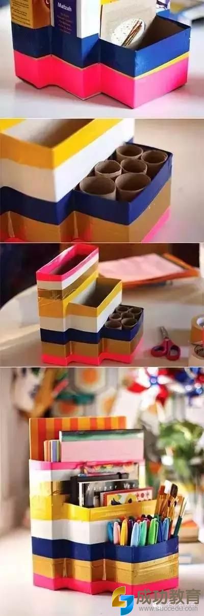 ▼卷纸芯、快递纸箱的桌面收纳筐,太赞了!