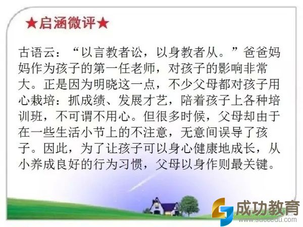 提醒:我们总是用别的小孩的标准来衡量自己的孩子,这会使孩子把注意力放在和别人比较上,长大之后做事就会轻易受其他人影响。