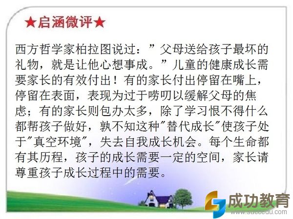 教子心得:在辅导孩子的学习上,不要太勤于指导,而要学会发现哪些是孩子能做的和有助于独立思考而可以放手的的,哪些是他能力达不到而需要帮助的。