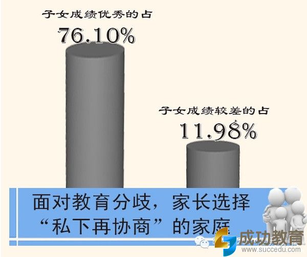 面对教育分歧,父母选择“私下再协商”的家庭,其子女成绩优秀的比例高达76.10%,而成绩较差的学生家庭选择比例仅为11.98%。