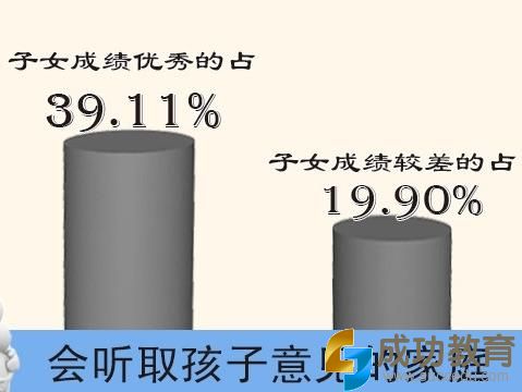 成绩优秀的学生家庭更多采用协商、民主的亲子互动模式。数据显示,“会听取孩子意见”的家庭,子女成绩优秀的占39.11%,而子女成绩较差的比例仅为19.90%。