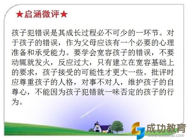 “人非圣贤,孰能无过”?再者“不知者还不为过”呢!人犯错误是正常的,而头一次经历某些事情的时候犯错更是正常的!但家长却没有给孩子足够的时间和空间去体验错误,尝试挫折,孩子甚至都不知道犯了什么错,批评和责备就已经接踵而至。这种急于求成、急功近利、急躁冒进的批评,往往扼杀了孩子的创造力,限制了孩子的发展。