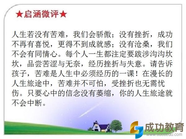 因此,在漫长的人生旅途中,苦难并不可怕,受挫折也无需忧伤。只要心中的信念没有萎缩,你的人生旅途就不会中断。艰难险阻是人生对你的另一种形式的馈赠,坑坑洼洼也是对你的意志的磨炼与考验——大海如果缺少了汹涌的巨浪,就会失去其雄浑;沙漠如果缺少了狂舞的飞沙,就会失去其壮观;如果维纳斯没有断臂,就不会因为残缺美丽而闻名天下。生活如果都是两点一线般的顺利,就会如白开水一样平淡无味。只有酸甜苦辣咸五味俱全才是生活的全部,只有悲喜哀痛七情六欲全部经历才算是完整的人生……