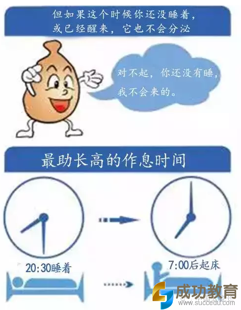 所以生长发育专家的建议是:要孩子长得高,最好在晚上8:30前就上床,最迟不要超过晚9:30,并在早上7点以后再起床。所以父母们要注意了,一定要让孩子养成早睡早起的好习惯!