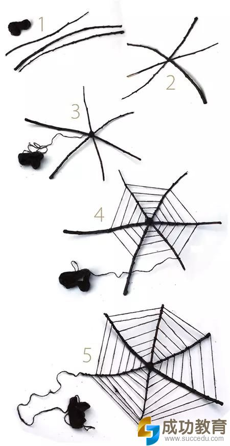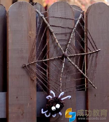 做法1:树枝毛线DIY蜘蛛网,毛线球和绒铁丝做只可爱的蜘蛛,挂在网上,装饰家里,很有万圣节气氛。