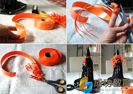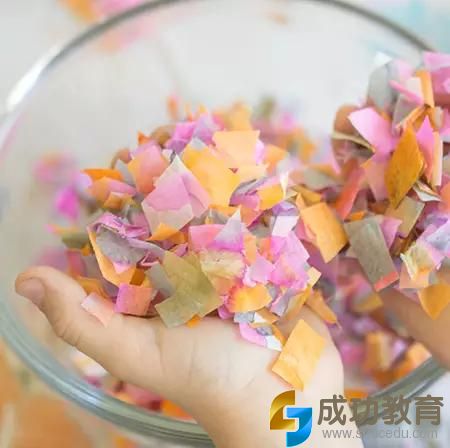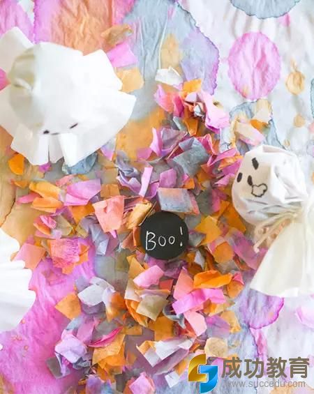 做法:将色素用滴管滴在面巾纸上,观察纸巾的晕染,晾干后,把纸巾剪成碎片。包在蛋糕纸托内,用毛线系紧,画上眼睛,可爱的纸屑鬼就完成了。派对上,可以设置一些游戏情节,让孩子拍打纸屑鬼的脑袋,哇,五颜六色的纸屑就出来了。