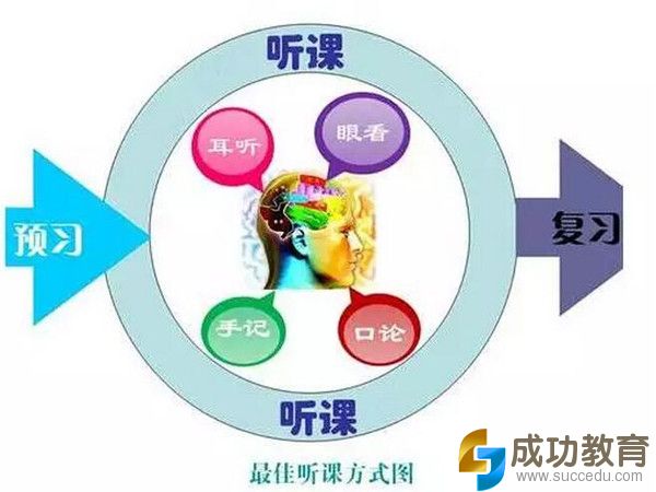 听课可不是一个孤立的活动哦!除了听课前让孩子的身体、情绪状态准备好外,还需要知识上的准备。上图就展示了听课的完整状态。要想提高听课效率,还得做好预习和复习。