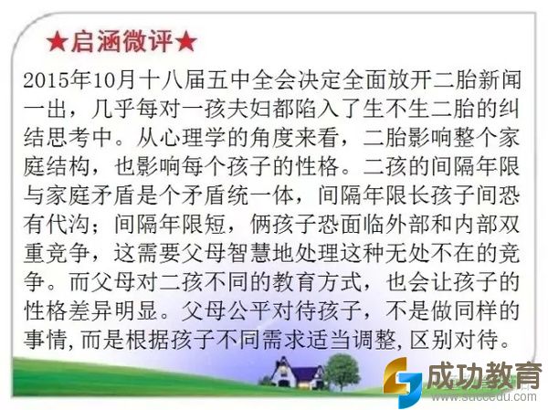 二宝父母需要考虑生育2个孩子的间隔年限,如果隔得太开,虽然家庭矛盾会少一些,但两个孩子恐怕已像两代人一样会有代沟。如果间隔年限太少,两个娃娃一同长大,既面临外部竞争,也面临内部竞争,父母得非常有智慧处理这种无处不在的竞争。