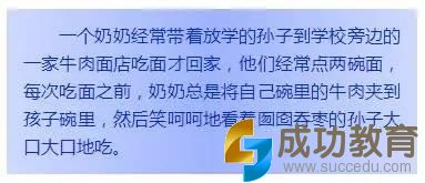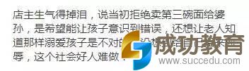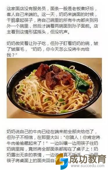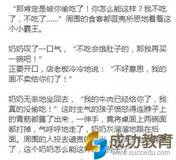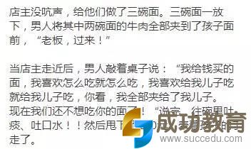 你没有把牛肉给我! 我的面不卖给你! 没多久,孩子带来了一个男人,看样子,应该是孩子的爸爸,后面跟着的奶奶在抹泪。这个男人一进门径直找到了店主,说:“给我三碗面!”然后气呼呼地坐下。 我买的面,我说了算! 溺子如害子,说得一点也没错! ———————————— 温馨提示: 最好的教育平台,搜