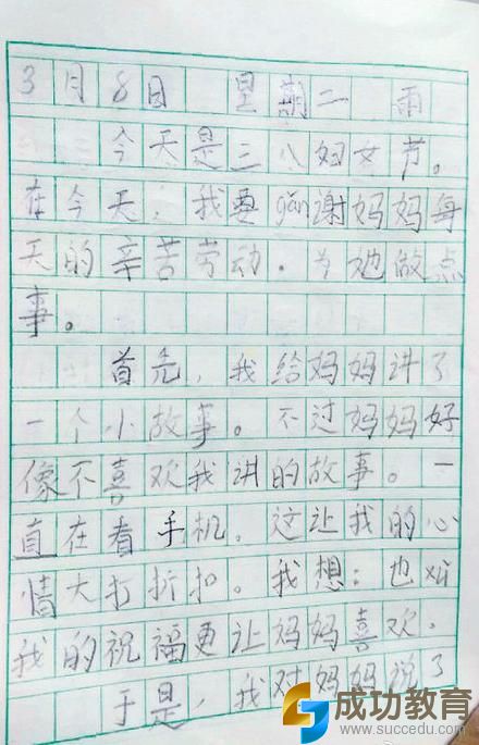 这是一位小学生在“三八”妇女节时,按照老师布置的以“感恩”为主题的作业要求,在为自己的妈妈送祝福、捶背、洗脚后写下的日记。孝敬父母是自然,但是妈妈的反应确实有所欠缺。都说父母是孩子最好的老师,父母们是否时刻想着自己的一言一行时刻都被孩子看到眼里呢?我们有时候抱怨孩子不孝敬自己,不懂礼貌、不会表达爱,但我们自己又是怎样做的呢?