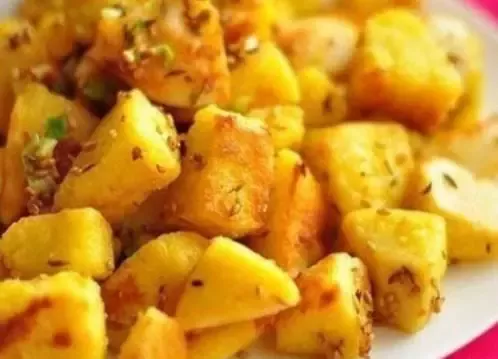 起锅热油,把馒头丁和孜然放锅里炒,小火翻炒至变色。