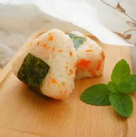煮好的米饭,拌入寿司醋。将也同样煮熟的胡萝卜粒拌入饭中。