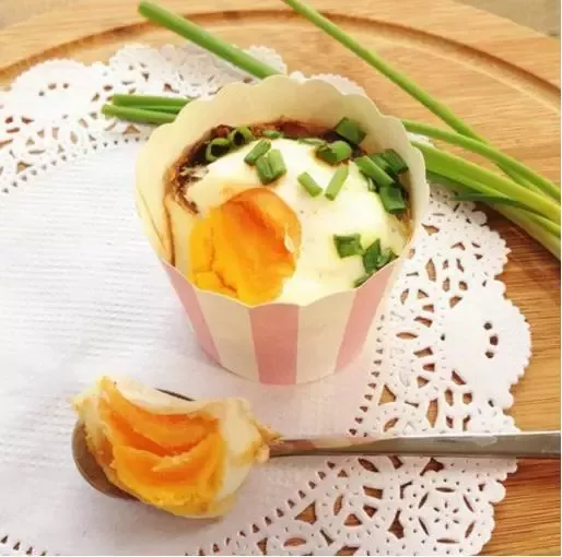 蛋糕纸杯里打入一个鸡蛋(无需打散),撒上香肠、葱花、芝士(或者有其他好看好吃适合的辅料也可以)。