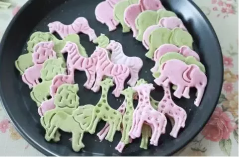 用压面机或者擀面杖压成薄一点的面片后,立体的饼干模来压花,可以多压一些形状,比较吸引孩子的注意。