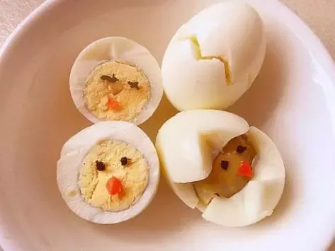 如果有耐心的粑粑麻麻,可以将鸡蛋一刀刀割锯齿状(动作要轻以免割到蛋黄)。然后将上半部分的蛋白轻轻分离,露出蛋黄,装饰上小鸡的眼睛和嘴巴,就能做出不一样的小鸡仔。