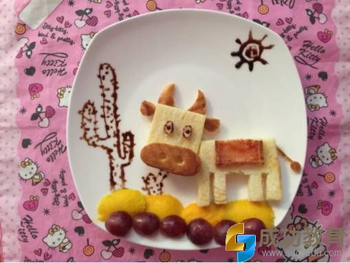 之后摆放上芒果、葡萄或者其他合适的水果进行调整造型。巧克力可以画上眼睛和煎蛋背景。憨厚激萌的方块脸牛牛就完成啦!