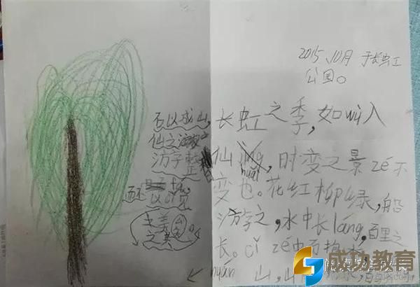 下面这首是去年10月份我带贝贝去公园寻找秋天时所画所思 ,供大家一看。不是为了炫耀,只想真心地告诉亲爱的们,“古诗离我们并不遥远,它们的存在是古人活过的证明,是生命燃烧后留下的痕迹。”