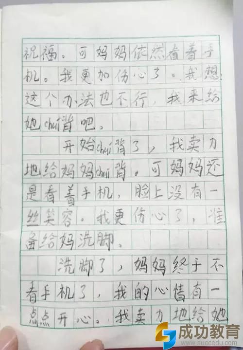 相信这不仅仅是个例,现实生活中很多家长都如此,在电子时代的今天,人们时时刻刻把手机捧在手上。这些小小的举动,有时候给孩子带来的却是不小的心灵伤害。可能很多家长都没有意识到这一点。希望手机一族的家长们看到这篇日记之后,能有所改变。
