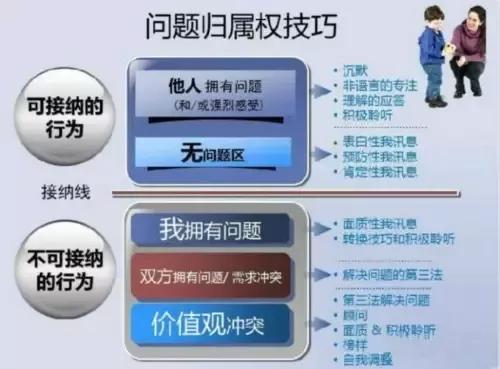 这张图中展示的内容叫做行为窗口,这一张表格能使我们在沟通的时候,不去纠缠于对方行为的“对错“,而是更多的从自己的感受出发。当我们谈感受而不是谈对错的时候,对方就更容易去接受我们意见,同时也就没有办法去反驳你,因为我们说的只是一个真实的感受而不是对对方的评价。