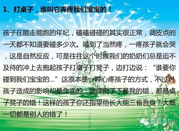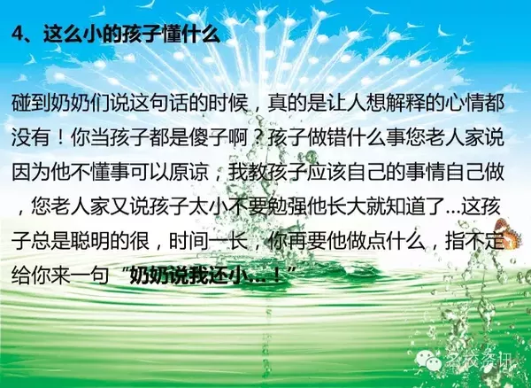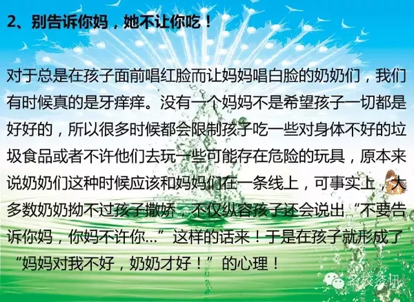 如今社会,很多全职工作的家长们,把孩子交给老人带已是再正常不过的事了,这给孩子爸爸妈妈省事省心了许多,需多感激老人们。不过在一些教育孩子的一些细节上,孩子的妈妈还是要有自己的主见,例如碰到一下情况,老人家会在孩子面前说这些话的时候,当妈的一定一定要及时阻止哦! 中小学家长都喜欢关注的微信,我