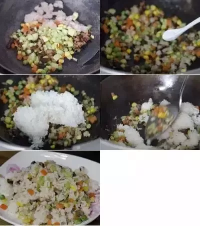 3.锅内热油至七分热时倒入除剩饭外所有的炒饭材料翻炒两分钟;