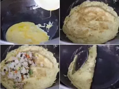 7.鸡蛋饼翻一个面,将炒饭放入蛋皮中间;