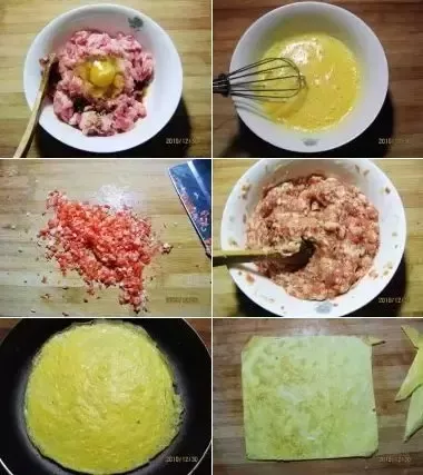 5.将蛋皮修整,蛋皮煎面朝上,抹肉馅;