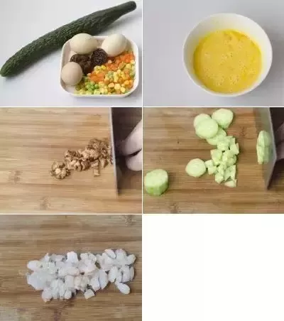 主料:剩饭500g、青瓜20g、鸡蛋50g、杂蔬100g、香菇10g、虾仁20g