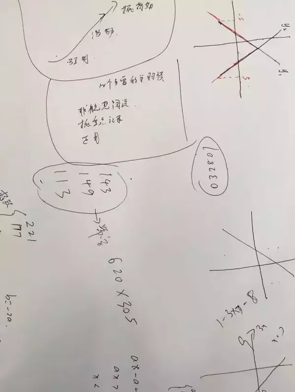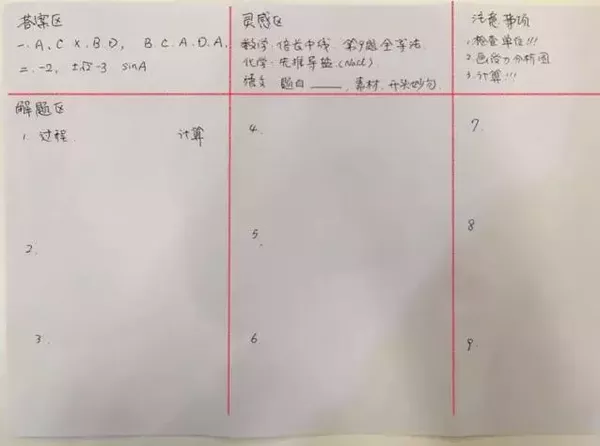2、 草稿本上折线,分隔。一般对折一下,先分成上下左右四块。灵感、火花占一块(可以右上),解题过程、思路写题号,顺序写,占一块(左边上下),计算占一块(右下)。