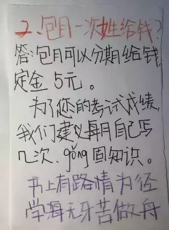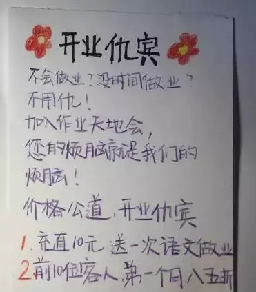 唐唐妈妈看了,非常感慨:现在的孩子真是不一般,简直就是霸道总裁的走向啊!我们那时候哪懂这些,他们已经开始发现商机、明码标价、做宣传海报了!这科目、这类型,分得清清楚楚,有条有理。现在的孩子太牛了!