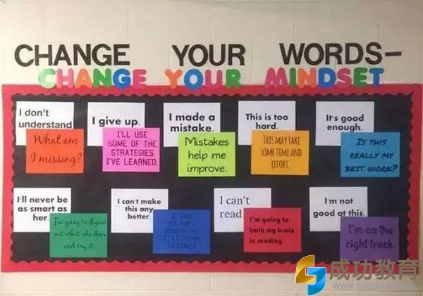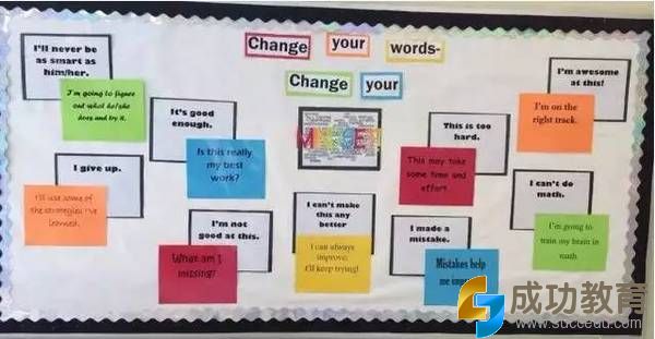 仔细观察可以发现,这些海报虽然样式各异,但内容几乎都是一样的,那就是:“ Change Your word, Change your mindset“(换个说法,换个思维),也就是培养成长型思维里最经典的”九个改变“。