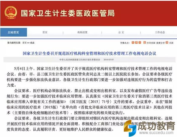 5月4日上午,国家卫生计生委召开了关于规范医疗机构科室管理和医疗技术管理工作的电视电话会议,由省、市、县三级卫生计生委医政医管负责同志及二级以上医院院长参加。会议要求各级医疗机构要进一步强化依法执业意识,各级卫生计生行政部门要进一步加强对违规医疗行为的监管和打击力度。
