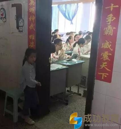 这是河南商丘某高中一位巡查老师在巡查时见到的场景,小女孩的妈妈正在教室里上课。