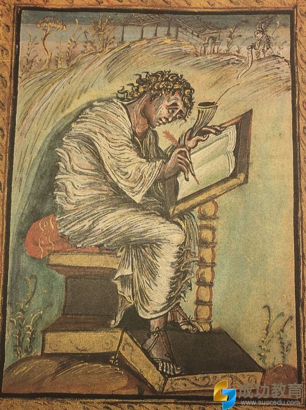 一些关于圣马太像的经典基督范本,通过一些人物曲线以及衣物的折皱等,用来表现圣马太的专心致志。此刻的艺术风格在延续,希腊化已经融合了东方古国及北方入侵民族的一些画风特点。