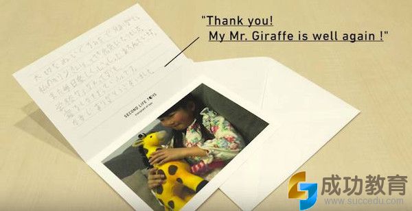 获得救助的玩具主人会给捐献者写一封感谢信:”谢谢你,让我的长颈鹿先生恢复健康!“