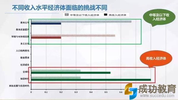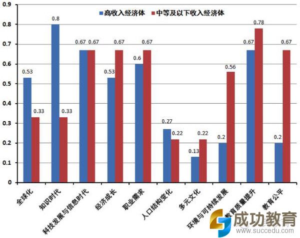 从不同收入水平经济体的比较看,无论收入水平高低,其教育都面临着科技发展与信息时代、经济成长、职业需求、质量提升的压力;比较而言,高收入经济体对“全球化”和“知识时代”可能带来的影响更为敏感;相反,中等及以下收入经济体对“教育公平”和“环境与可持续发展”的关注更加迫切。
