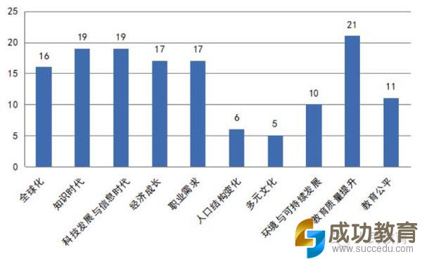 分别为:时代与科技变革类动力因素,如全球化、知识时代、科技发展与信息时代;经济与社会发展类动力因素,如经济成长、职业需求、人口结构变化、多元文化、环境与可持续发展;教育发展类动力因素,如教育质量提升、教育公平。